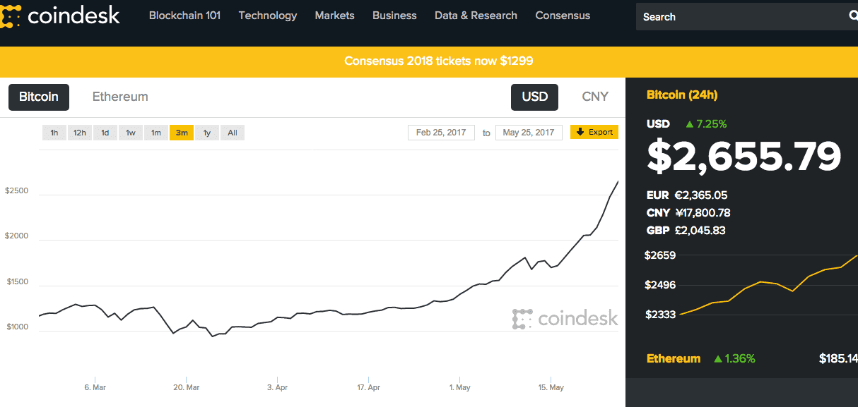 Necelých pět měsíců – víc než dvojnásobek. Ještě na začátku ledna se řešil třetinový propad hodnoty virtuální měny kvůli vyšetřování bitcoinové burzy v Pekingu. Od té doby ale hodnota měny roste a z tisíce dolarů se dnes pohybuje už kolem hranice 2700 dolarů.