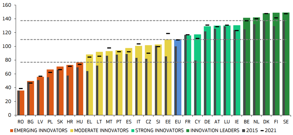 “I nadále je v EU možné vypozorovat velké rozdíly v inovační kapacitě. Jednotlivé výkonnostní skupiny jsou většinou koncentrované do určitých regionů: lídři v oblasti inovací a většina silných inovátorů se nachází v severní a západní Evropě, zatímco většina průměrných a začínajících inovátorů se nachází v jižní a východní Evropě,” vysvětluje Evropská komise.
