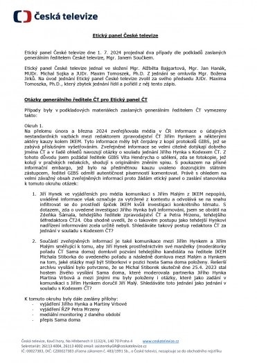 „Pokud redaktor Jiří Hynek použil takzvanou redakční legendu, tedy vytvářel si jisté zázemí pro získání informací z prostředí institutu IKEM, pak o takovém mimořádném postupu investigativní žurnalistiky měli být informováni jeho nadřízení. A to se z písemných podkladů, které byly Etickému panelu doručeny, nepotvrdilo,“ parafrázoval závěry panelu generální ředitel Jan Souček při dnešním veřejném jednání Rady ČT. Jiří Hynek do konce prázdnin čerpá neplacené volno. V dané věci ho mezitím začala zastupovat advokátní kancelář, čerstvě doručila také vyjádření k závěrům Etického panelu. „Ještě jsem neměl příležitost se s ním seznámit, na základě toho bude probíhat další komunikace,“ uvedl generální ředitel Jan Souček při zasedání Rady ČT.