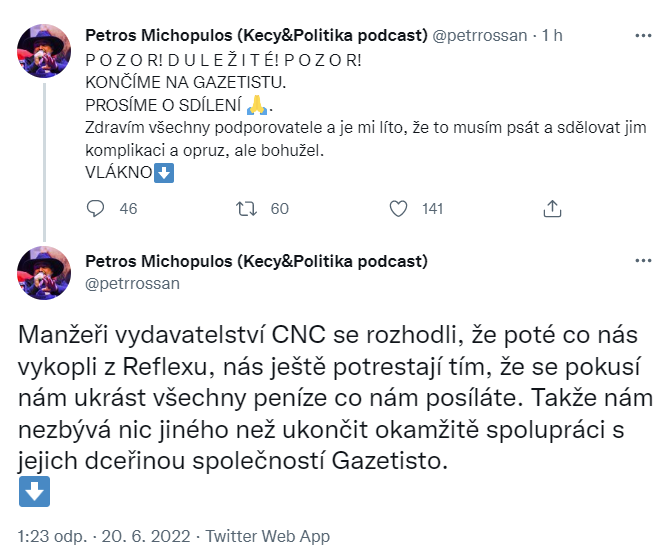 „Manažeři vydavatelství CNC se rozhodli, že poté co nás vykopli z Reflexu, nás ještě potrestají tím, že se pokusí nám ukrást všechny peníze co nám posíláte. Takže nám nezbývá nic jiného než ukončit okamžitě spolupráci s jejich dceřinou společností Gazetisto,“ tweetl Petros Michopulos, který je společně s Bohumilem Pečinkou autorem podcastové série.
