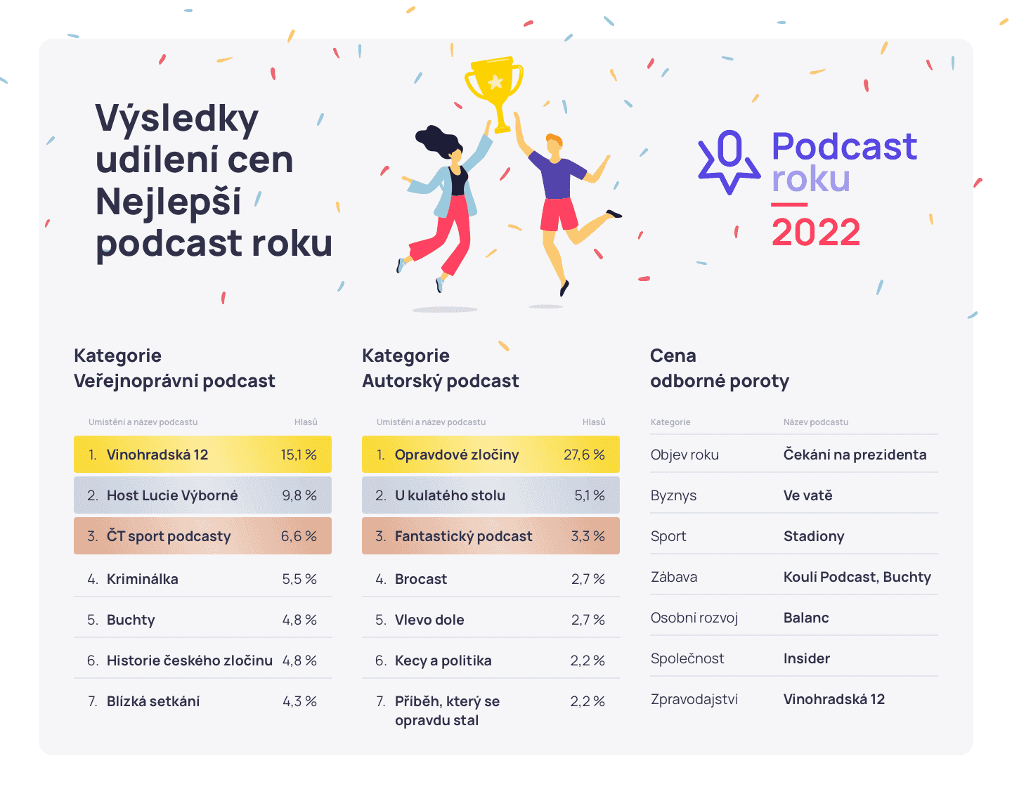 Čtvrtý ročník ankety Podcast roku vyhrály internetové pořady Vinohradská 12 (Český rozhlas) a Opravdové zločiny (Lucie Bechynková, Bára Krčmová). Rozhodli o tom posluchači hlasující na webu ankety. „Opravdové zločiny získaly celkem 27 % hlasů, což znamená přes 61 tisíc hlasů, a staly se tak i absolutním vítězem,“ oznámili pořadatelé.