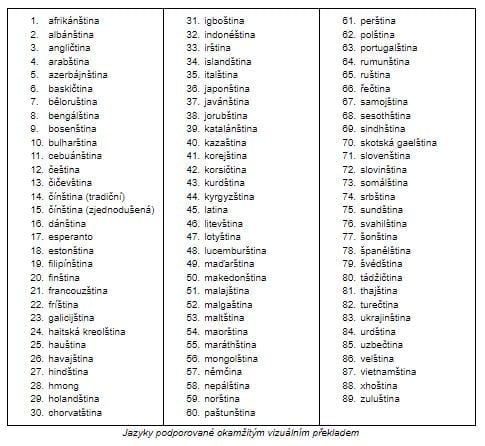 Překladač Googlu (Google Translate) umí překládat texty přímo v obrázcích snímaných fotoaparátem mobilu už od července 2015 – a stejně dlouho podporuje také překlad do češtiny. Dnes Google oznámil navýšení počtu podporovaných jazyků a vylepšení kvality překladu.