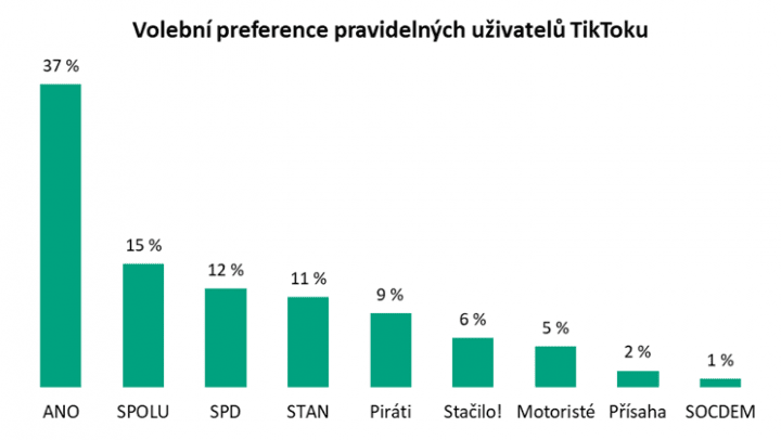 Zajímavá zjištění přinesla analýza sítě TikTok, kterou pravidelně využívá 14 % dotázaných, převážně ve věku do 30 let. Mezi uživateli TikToku jsou nadprůměrně zastoupeni voliči hnutí ANO (37 %). Naopak podíl voličů SPOLU a STAN je zde výrazně nižší.