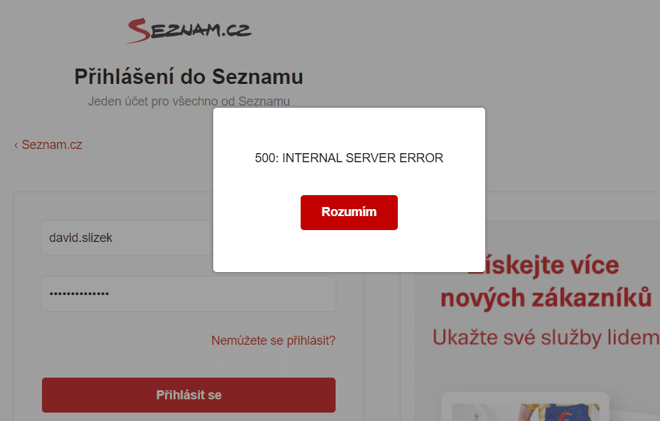 Společnosti Seznam.cz momentálně nefungují e-mailové služby. Při pokusu o přihlášení se uživatelům zobrazují chybová hlášení 500: Internal Server Error a další.