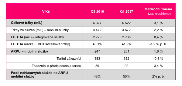 V prvním čtvrtletí 2017 zákazníci T-Mobile v průměru provolali 158 minut měsíčně, tedy o 1,9 procenta více než loni. Celkový objem přenesených dat meziročně vzrostl o 47,3 procenta a dosáhl 10 420 terabytů.