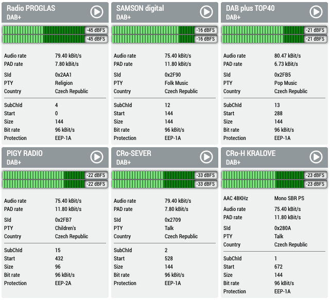 „Stávajícími vysílanými stanicemi jsou country Rádio Samson, hitové DAB plus Top 40, křesťanská stanice Rádio Proglas, rádio pro děti Pigy (dostupné pouze v síti DAB2) a některé vybrané regionální stanice Českého rozhlasu – Sever a Hradec Králové,“ sdělila firma na svém webu.