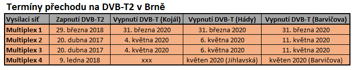 Jak dnes informoval server Televizní web, poslední březnový den v roce 2020 přestane v Brně vysílat ve stávající normě DVB-T veřejnoprávní Česká televize a v květnu téhož roku ji budou následovat i všechny komerční televizní stanice.