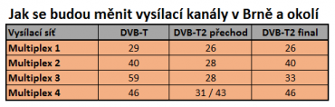Regionální DVB-Tmultiplexy na území Brna mají skončit ke 30. červnu příštího roku, a to bez náhrady. Je ale možné, že Český telekomunikační úřad jejich kmitočty prodlouží do konce příštího roku nebo prvního čtvrtletí roku následujícího.
