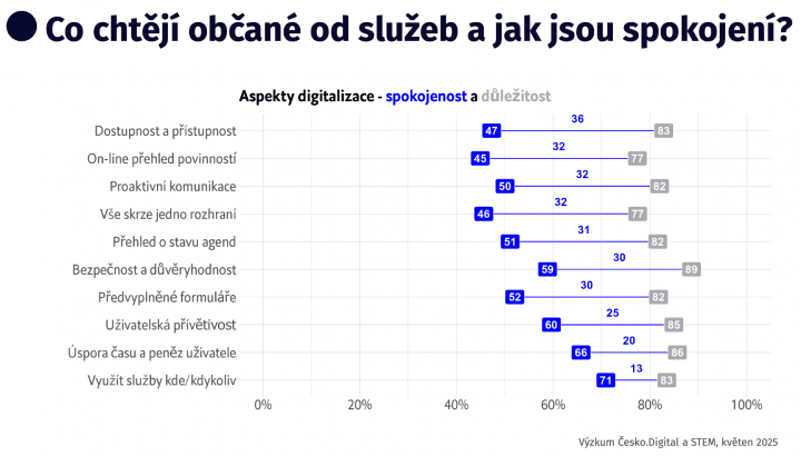 “Devět z deseti lidí považuje digitální služby státu za své právo, jen čtyři z deseti jsou s nimi ale spokojeni. A dokonce jen tři lidé z deseti si dokáží vybavit konkrétní příklad zlepšení digitalizace za poslední roky. Téměř 90 % lidí považuje za zásadní aspekt digitalizace bezpečnost a důvěryhodnost služeb – ale jen 59 % je s tímto aspektem spokojeno. A každá třetí firma ztrácí kvůli nedostatečné kvalitě digitálních služeb státu čas,” shrnul výzkum.