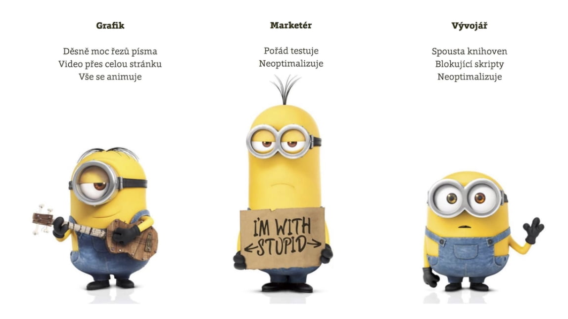 Nedávno jsem si dělal nehezkou legraci z designérů (kteří do stránky vkládají desítky řezů písma a obrovské animované prvky), vývojářů (kteří přidávají desítky jQuery knihoven) a marketérů (kteří weby dorazí svými skripty pro A/B testování a analytiku). Nazval jsem je rychlostními mimoni.