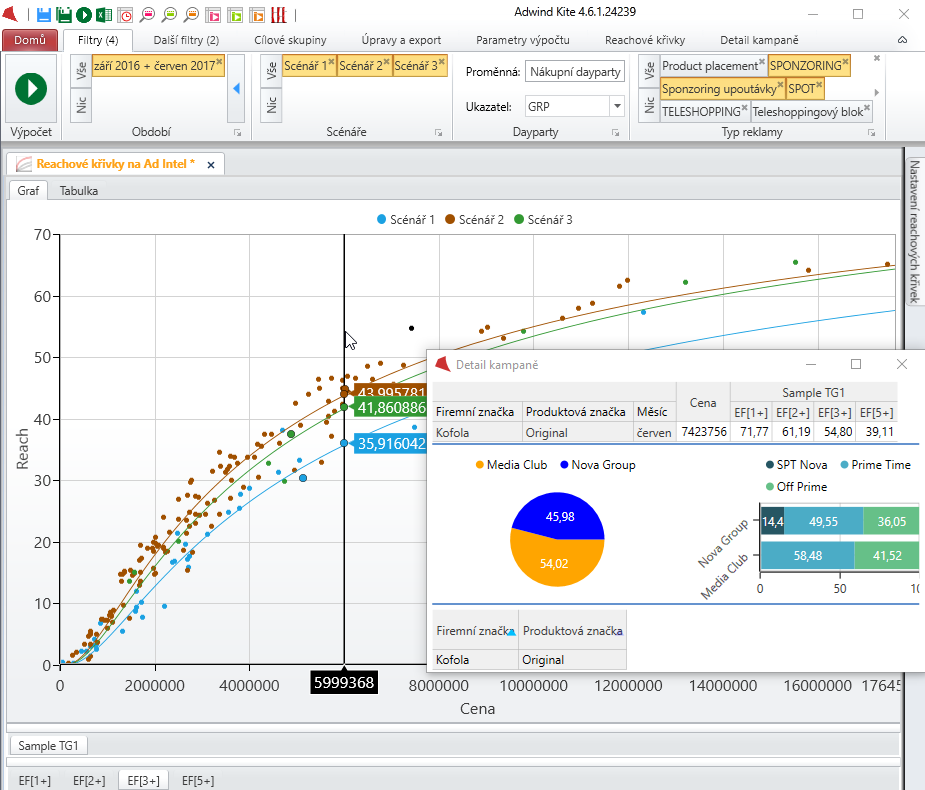 Ukázka reachových křivek dle ceny pro tři fiktivní scénáře a detailu vybrané kampaně. Upozornění: Ceny jsou fiktivní a neodpovídají realitě, protože Adwind Software reálné ceny nezná (klikněte pro zvětšení).