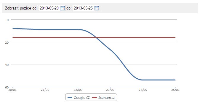 Pokud vás Penguin zasáhne, nečekejte žádnou zprávu v Google Webmaster Tools. Nejedná se o manuální, ale algoritmickou penalizaci, proto žádné upozornění neobdržíte. Zpravidla dojde k propadu pozic u vyhledávače Google o desítky procent. Může to vypadat například nějak takto: