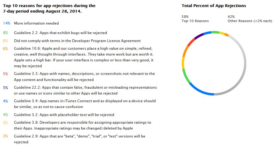 Tím zdaleka nejčastějším jsou chybějící, resp. nedostatečné informace. Přestože Apple nekonkretizuje, co konkrétně si pod „nedostatečnými informacemi“ představit, zřejmě půjde o příliš stručný popisek aplikace, chybějící screenshoty či názorné ukázky.