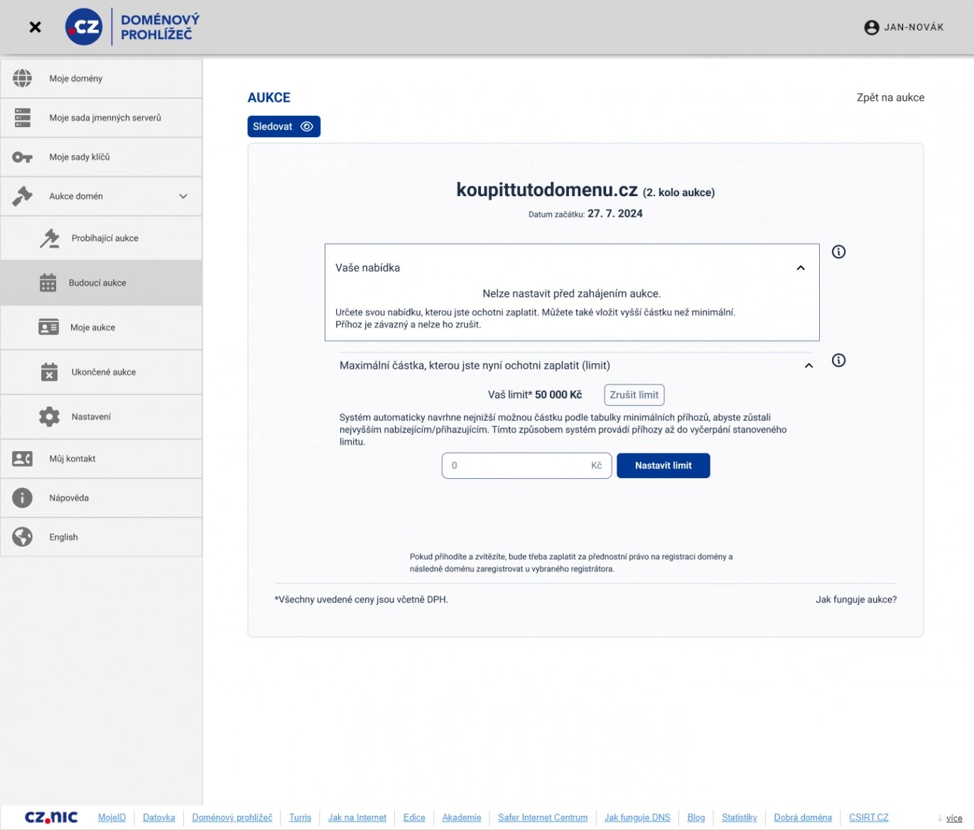 Další, určitě ještě revolučnější změnou, kterou aktuálně implementujeme, je možnost zadat při aukci viditelný příhoz. Tuto možnost, stejně jako tu předchozí, přidáváme na základě přání dražitelů a tato by měla v určitých případech zrychlit průběh aukce. V systému i nadále ponecháváme možnost nastavení limitu (maxima), které slouží dražiteli jako automat, který mu doménu vydraží za optimální cenu pod nastaveným maximem. Opět přikládám obrazovku, která tuto změnu zohledňuje.