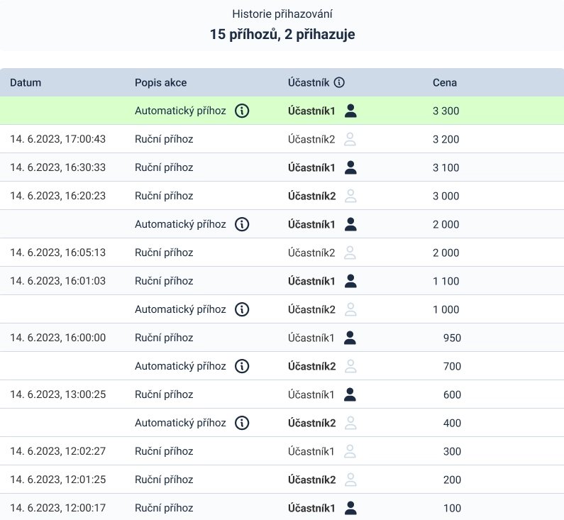 Třetí významnější změnou, kterou můžete již brzy očekávat, je změna zobrazení historie aukce, kde se nově snažíme lépe vysvětlit zejména automatické příhozy a zpřehledňujeme zobrazení příhozů celkově.