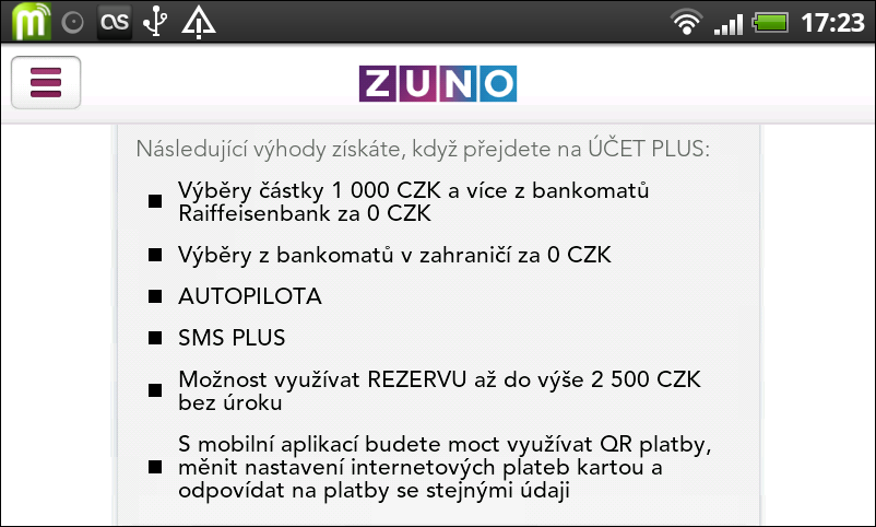 Z podpory platebních kódů a dalších funkcí mobilního bankovnictví si banka ZUNO udělala výhody služby Účet Plus