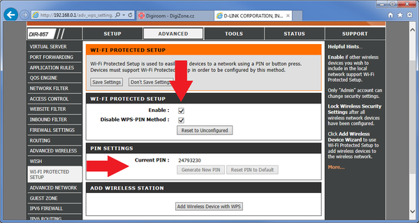 WiFi Protected Setup obvykle pro snazší připojení zařízení k zabezpečené síti používá tlačítko WPS a PIN. Doporučujeme vypnout podporu přihlašování přes PIN.