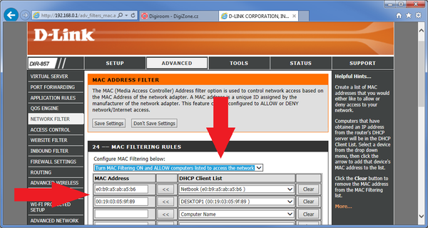 - Pokud chcete dosáhnout velmi vysoké úrovně ochrany, můžete nastavit filtr, který do vaší bezdrátové sítě nevpustí jiná než předem zvolená zařízení (založen je na unikátních tzv. MAC adresách).