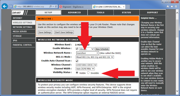 Dle názvu sítě (SSID) by rozhodně neměl být identifikovatelný jeji provozovatel. Síť lze volitelně také skrýt.