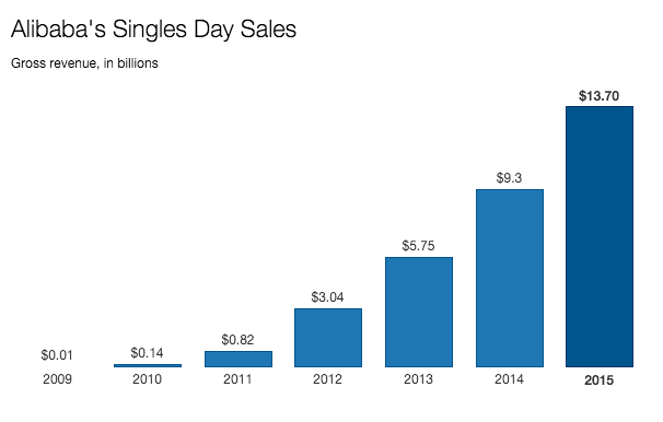 Světovou e-commerce scénou ale začíná hýbat ještě jeden svátek – čínský „Singles Day“. Ten si vymysleli studenti v devadesátých letech, ale ujal se i v marketingovém oddělení největšího čínského e-shopu Alibaba. Před sedmi lety se z něj stal oficiálně den zlevněných nákupů a letos se do něj zapojilo už 40 tisíc obchodů. Podle IDC se má závěrečná účtenka za nákupy u Alibaby letos vyšplhat na 13,7 miliardy dolarů.