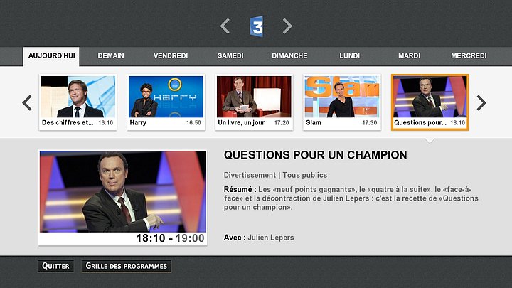Zatímco francouzská komerční skupina NRJ by mohla inspirovat hudební Óčka, tamní veřejnoprávní televize se mohla stát do určité míry vzorem pro Českou televizi. Právě Francie je v rámci tohoto standardu ve velmi pokročilém stádiu. Navíc, France Televisions je na pozici 5 stupňů západně nekryptovaná, takže si ji může sledovat kdokoliv i bez dekódovací karty. Jenže… Veřejnoprávní televize nabízí na satelitu překvapivě málo aplikací. V podstatě jsme tu našli pouze dvě – informace o aktuálně vysílaném pořadu a programového průvodce. To je opravdu hodně málo.