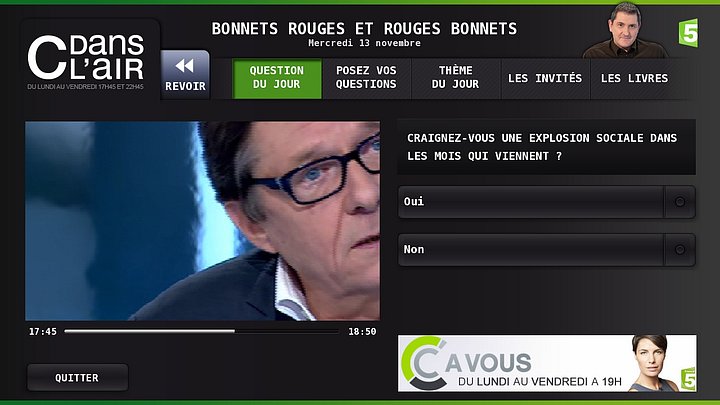 Na druhou stranu, je pravda, že se tu čas od času objeví aplikace, která je přímo šita na míru danému pořadu. S něčím podobným přišla Česká televize u aktuálního ročníku StarDance. Francouzi posunují možnosti hybridní televize mnohem dál. Nejen, že si můžete například zahlasovat v anketě, ale můžete odeslat příspěvek (otázku) do pořadu formou virtuální klávesnice přímo v aplikaci. Přibližně může být nastíněno také téma vysílaného pořadu a jeho jednotliví hosté. Profilové portréty nastiňuje aplikace „C Dans L’air“, z níž si můžete prohlédnout screenshoty v přiložené fotogalerii. Aplikace na míru jsou přesně tím, co může diváky k této technologii přitáhnout.