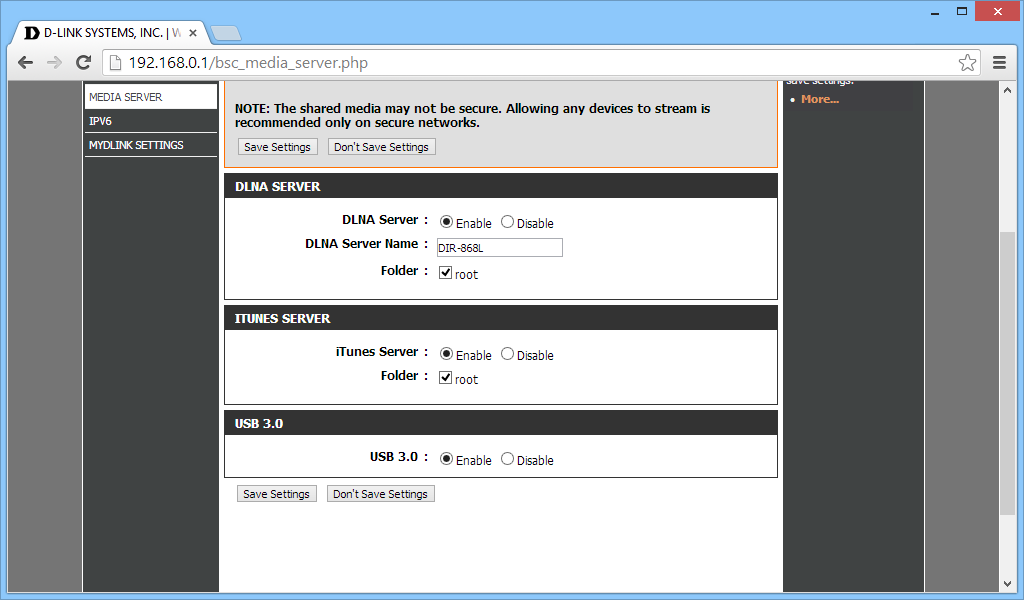 DLNA server lze vypnout, takže připojený flash disk či externí pevný disk pak funguje jen jako klasické síťové úložiště staršího střihu určené výhradně pro sdílení dat mezi různými počítači. Router však nenabízí Samba server či FTP server, takže pro přístup na paměťové médium z osobního počítače je nutné nainstalovat utilitu SharePort Plus z přibaleného média, která podporuje Windows XP a vyšší nebo OS X 10.6 a vyšší.