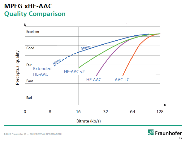 Rodina AAC kodeků je mocný nástroj na kvalitní přenos zvukového signálu při nižších datových tocích, ale i společnosti podílející se na jejich vývoji uznávají pokles subjektivně vnímané kvality zvuku ve zmíněném rozmezí bitrate – v následujícím obrázku verze HE-AAC a HE-AAC v2. Snížení kvality u AAC nemusí nutně znamenat, že se ve zvuku objeví znatelné zkreslení, spíš se jedná o to, že „tam něco chybí“.