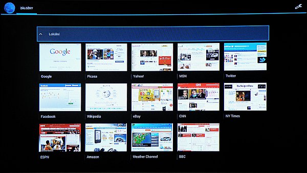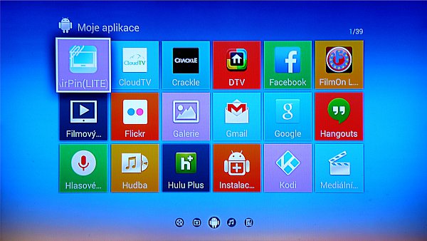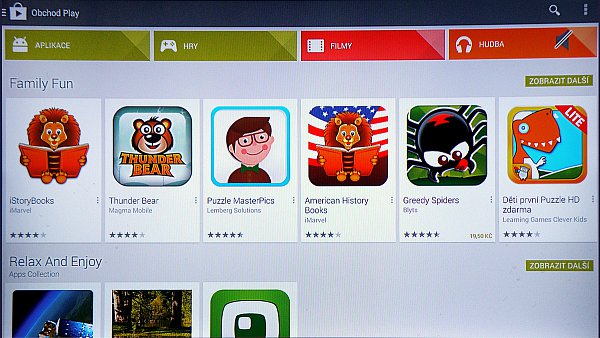 V menu Aplikací jsou zobrazeny ikony aplikací, které si sami můžete nainstalovat nebo odinstalovat. Díky Google Play lze funkčnost neustále rozšiřovat, stahovat můžete nové hry a aplikace bez omezení. Některé jsou součástí instalace. On-line prohlížení videowebů: Netflix, Skype, ICQ, Hulu, Flicker, Picasa, YouTube, Twitter, Facebook, možnost stahování aplikací z Google Play a Amazon App Store. Můžete si číst i e-maily prostřednictvím stejnojmenné aplikace a k dispozici je i jednoduchá herní konzole.