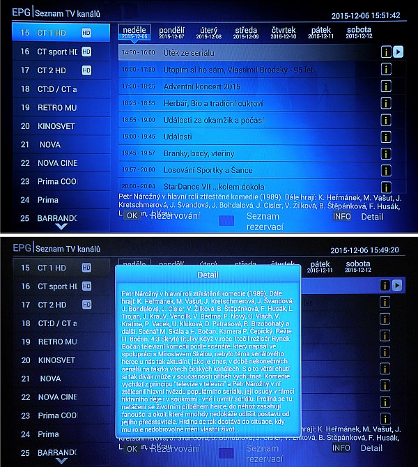 EPG seřazené podle seznamu kanálů s podrobným popisem zvoleného programu
