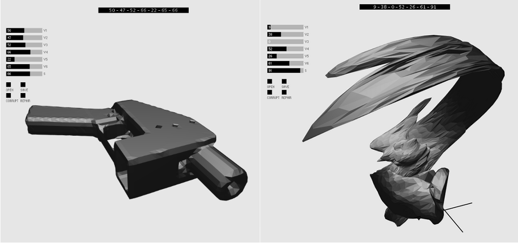 Napsal proto software Disarming Curruptor — zatím jen pro Mac OS X — který pracuje se soubory STL a v nich uložené 3D modely dokáže přetvořit k nepoznání. Míru toho, jak moc k nepoznání, lze přitom určovat hodnotou od 0 do 100.