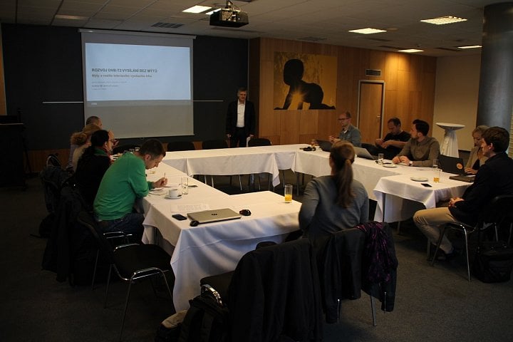 U paty žižkovské věže v kongresovém centru Českých Radiokomunikací představil dnes jejich ředitel pro regulaci a strategii Marcel Procházka přítomným novinářům aktuální stav přechodu na DVB-T2 a vyhranil se proti argumentům České asociace satelitních operátorů. Fotograficky setkání zachytil šéfredaktor serveru TelevizníWeb.cz Jan Potůček.