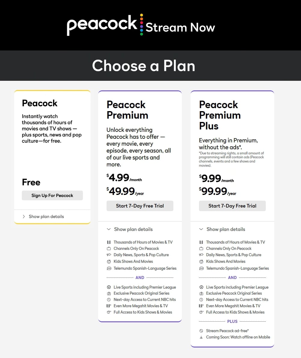 Kompletní katalog služby obsahuje více než 20 000 hodin filmů, seriálů, zpráv a sportovních přenosů včetně exkluzivních originálních pořadů vytvořených přímo pro Peacock. Je dostupný ve dvou placených variantách: Peacock Premium (4,99 USD měsíčně – obsahuje reklamy) nebo Peacock Premium Plus (9,99 USD měsíčně – zcela bez reklam).