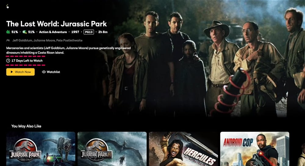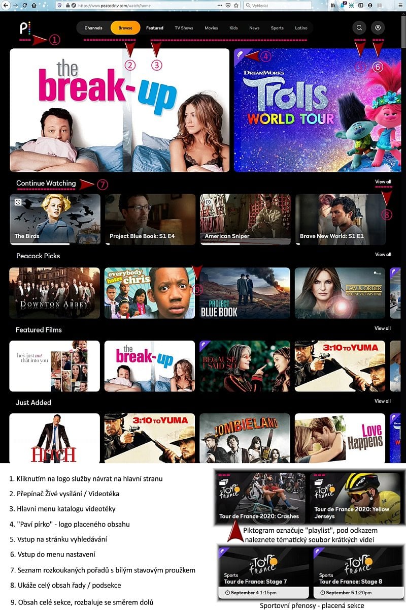 Ve čtvrté galerii z testu předvedeme přehrávání z katalogu filmů. Začneme časově omezenou nabídkou bezplatného streamu (s vloženými reklamami) filmu Americký sniper studia Warner Bros. Barevné čtverečky na stavovém proužku filmu ukazují umístění a počet reklamních bloků (cca 30 sekund dlouhých). Druhý v řadě byl kultovní horor Ptáci od Alfreda Hitchcocka. V bezplatné nabídce aktuálně nalezneme třeba kultovní Útěk z New Yorku s Kurtem Russellem v hlavní roli nebo prvního Highlandera, životní roli Christophera Lamberta.