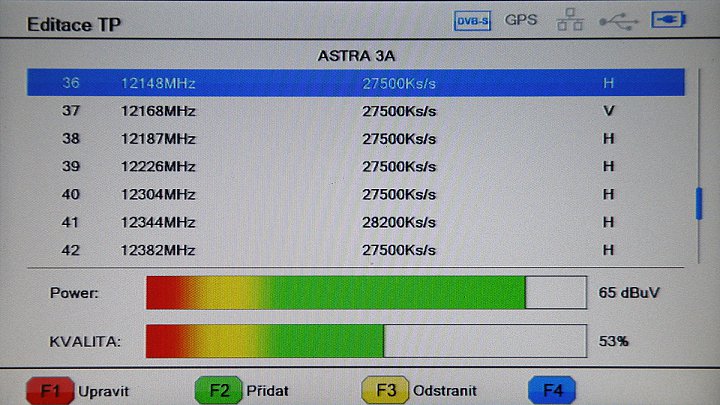 V Menu vyhledáme požadovaný satelit, typ LNB, transpondér, zvolíme typ vyhledání. Na grafickém zobrazení můžeme sledovat úroveň kvality signálu, nebo i počtu chyb, sledovat signál / šum (C / N), poměr modulace / chyby (MER), poměr bitů / chyby (BER).