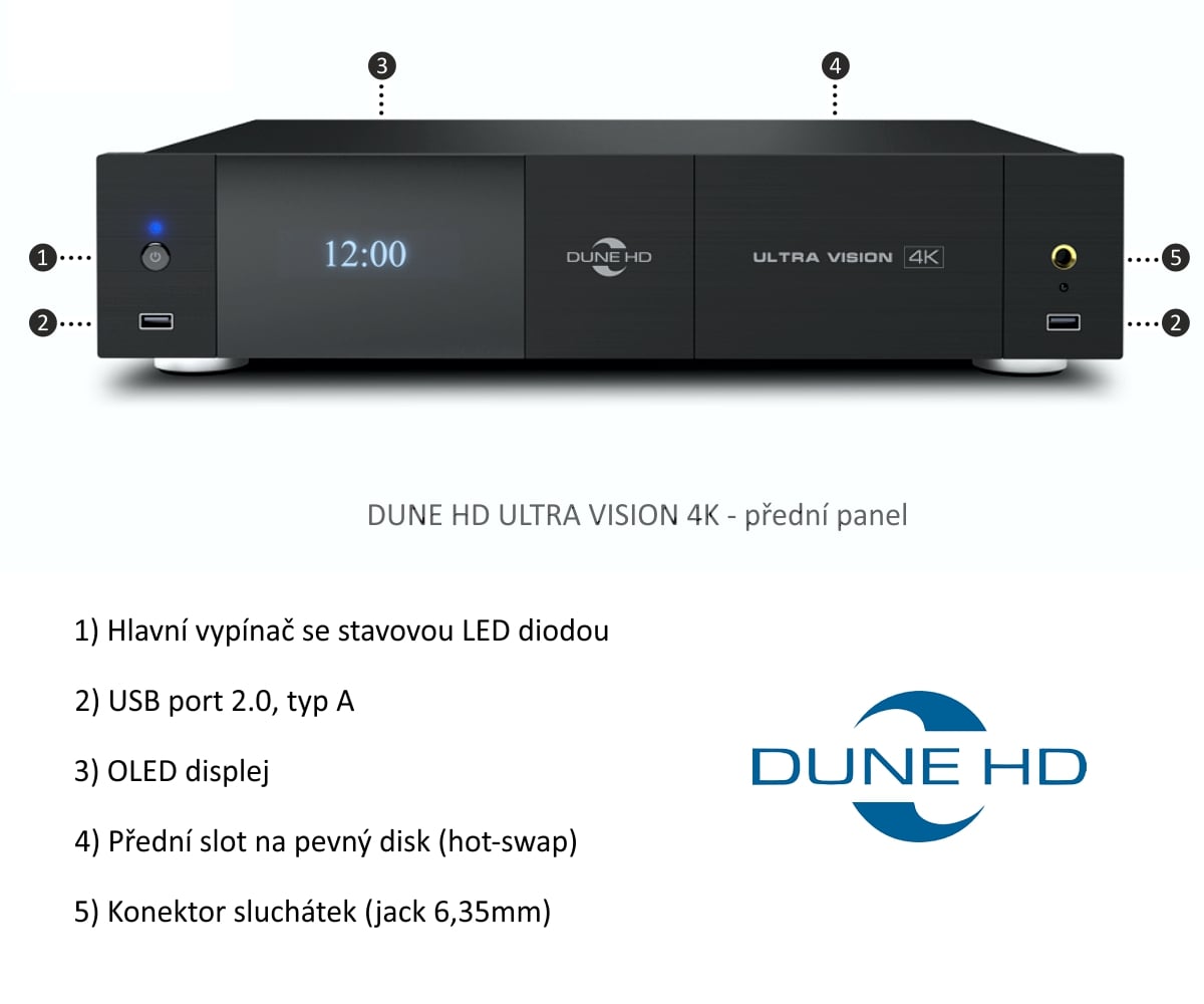 Co za tento obnos případný zájemce obdrží? Firemní vlajkové multimediální centrum založené na nejnovějším procesoru RTD1619 společnosti Realtek a duálním operačním systémem Dune HD OS + Android 9.0. Paměťová konfigurace 4/32 GB. 2 pozice pro HDD. Podpora Dolby Vision a HDR10 +, hi-end audio DAC ES9038PRO, Hi-Fi analogové i digitální audio výstupy, dva HDMI výstupy + 1 vstup, USB typu 2.0 a 3.1, USB typu C. 1Gb Ethernet, Wi-Fi 2,4/5 GHz. Sluchátkový zesilovač, NFS, SMB, YouTube 4Kp60 HDR…