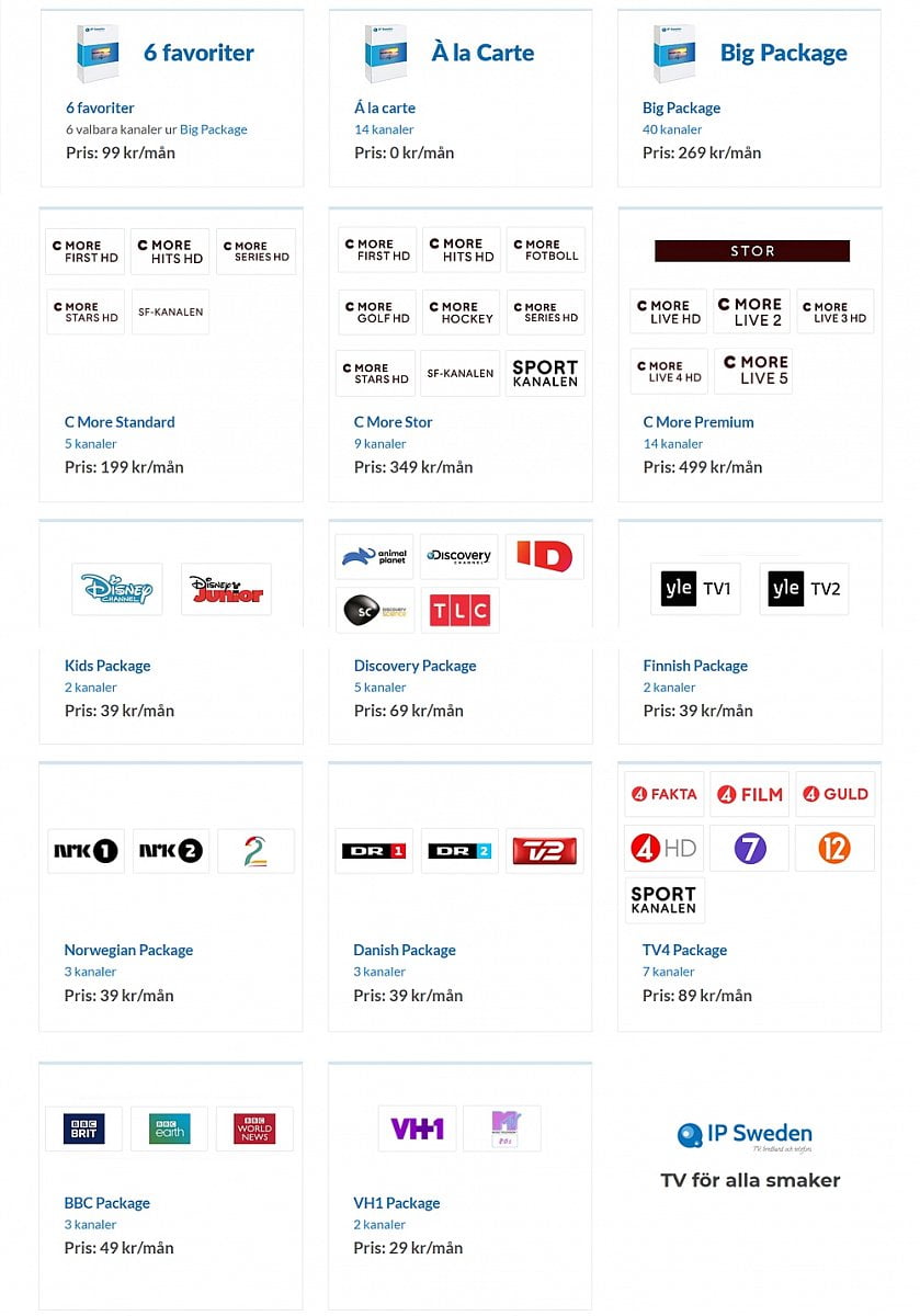 Dalším referenčním projektem je platforma s označením IPSweden pro Švédsko. Místním specifikem je použití jednotné platformy (a jednotné nabídky), kterou však nabízejí lokální distributoři, ne jeden centralizovaný operátor. Lokální distributoři zde obvykle kromě TV nabízejí internet, mobilní i pevný telefon, někteří také třeba i plyn či elektřinu. Nabídku IPSweden můžete vidět na přiloženém obrázku. Za balíčky s označením „CMORE“ se skrývá místní partner skupiny CANAL+. Vybrané programy lze také přijímat metodou „a la carte“.