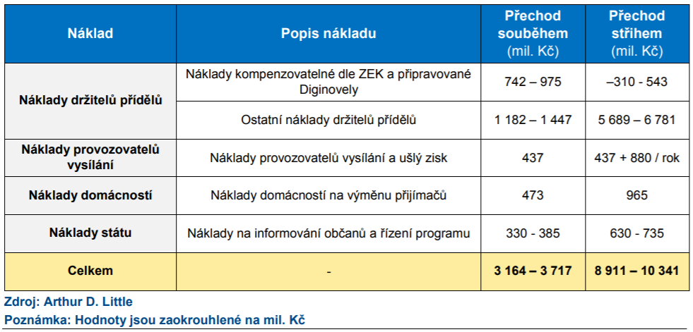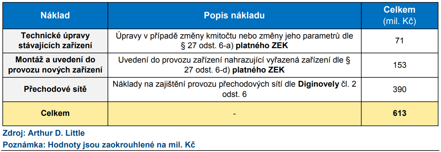 Stát předpokládá, že Českým Radiokomunikacím, Czech Digital Group, Digital Broadcasting a České televizi vyplatí celkem 613 milionů korun. „Kompenzované náklady se vztahují pouze k technickým úpravám zařízení technických operátorů sítí a montáží a uvedením do provozu nových zařízení,“ vysvětluje analýza.