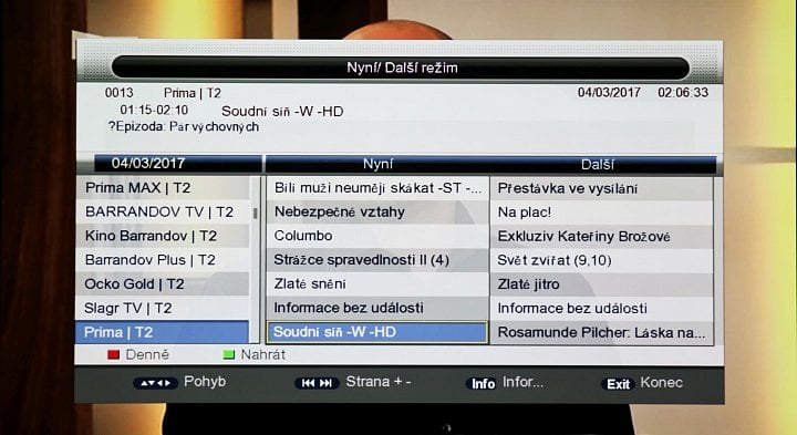 Programový průvodce EPG má, kromě obvyklé podoby časových os pro jednotlivé pod sebou uspořádané stanice se 14denním rozsahem, i možnost přepnutí do denního režimu či na zobrazení nazvané Nyní/Další režim. Správnější by ale bylo Nyní/Další program, protože pro jednotlivé stanice je zde zobrazen běžící a následující pořad.