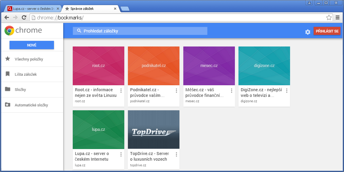 Nový správce záložek vyměnil prostý textový seznam za dlaždice, kde může být logo či náhled webu, ale pro už existující záložky se hned nevytvoří, takže ke slovu přicházejí (ne)populární barvičky.
