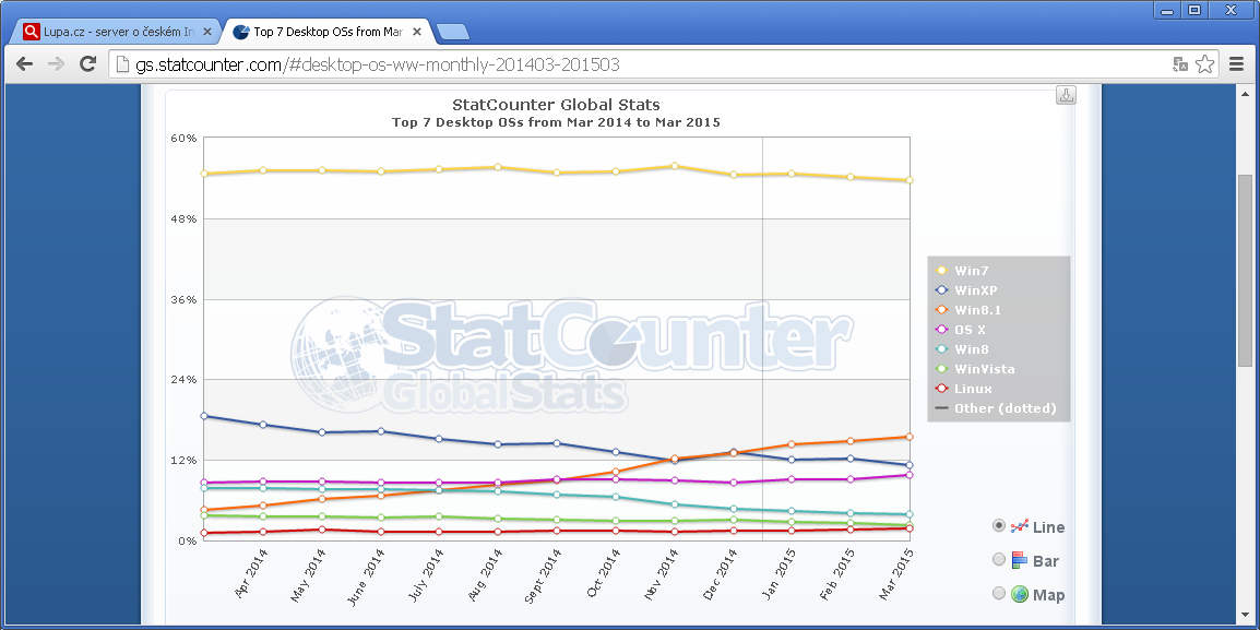 Windows XP během uplynulých dvanácti měsíců (od začátku března 2014 do konce března 2015) ztratila dlouholetou pozici tržní dvojky.