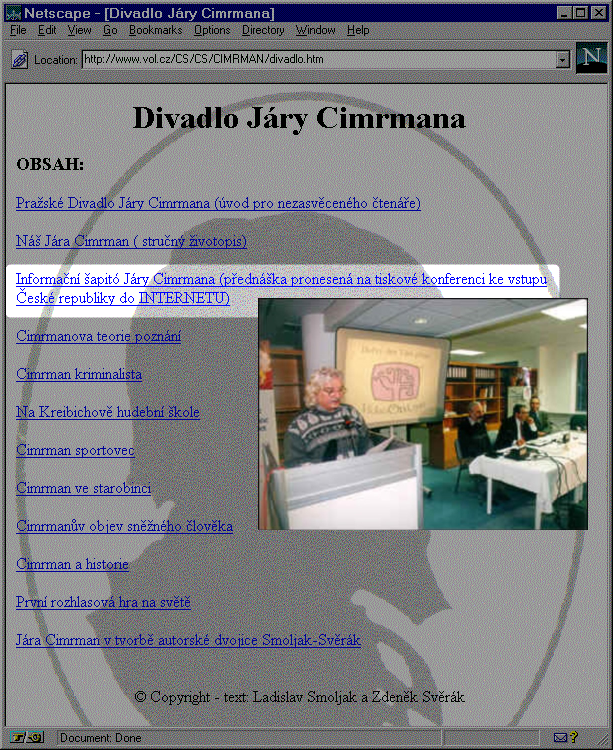 Mimochodem, obsahem oné přednášky, přednesené dne 7. prosince 1995, bylo to, co se asi dalo předpokládat: že Internet (a asi i internet) ve skutečnosti vynalezl Jára Cimrman. A to víte, že právě jemu vděčíme i za jeden významný počin na českém internetu? Že ne? Tak se určitě podívejte ještě na poslední video.