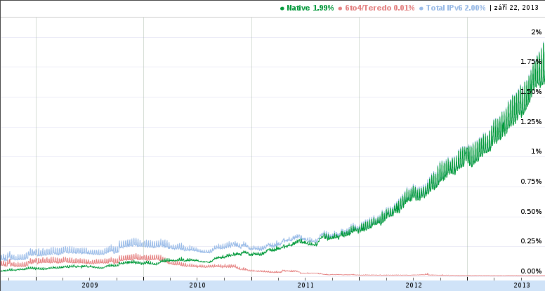 Příspěvek o rostoucím využívání IPv6 dnes vyšel na blogu CZ.NIC. Ondřej Filip v něm zmiňuje nárůst reálných IPv6 toků, které podle Googlu nedávno překročily 2 %. „To sice nezní jako nějaké ohromující číslo, ale na druhou stranu se podíl IPv6 meziročně více než zdvojnásobil, protože loni v této době byl tento poměr nižší než 1 %,“ píše výkonný ředitel sdružení CZ.NIC.