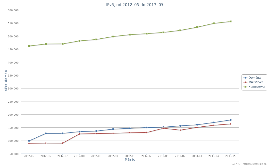 Z pohledu nabídky obsahu přístupného přes „šestku“ mají pro české uživatele největší vypovídající hodnotu statistiky sledující podporu IPv6 v rámci české domény, tj. dnes již více než milionu adres. Zatímco ke konci května loňského roku podporu IPv6 vykazovalo 10,6 % webových serverů, dnes je tento ukazatel o dvě třetiny vyšší (17,3 %) což v absolutních číslech představuje nárůst o 79 996 domén. Ještě zřetelnější nárůst vykazuje podpora IPv6 na jmenných serverech (DNS), kdy se v průběhu srpna loňského roku podařilo překonat magickou hranici 50 % a dnes je už IPv6 zapnutá na 53,8 % jmenných serverech. V neposlední řadě je potěšitelná podpora IPv6 i ze strany mail serverů, která významně stoupla zejména v průběhu loňského července a dnes dosahuje 15,8 %, tj. o 6,3 procentního bodu více, než v loňském roce a téměř stejně, jako činí podpora „šestky“ u webových serverů.