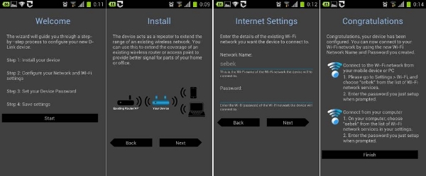 Instalace je velice jednoduchá a dělá se buď přes tlačítko WPS (současné stlačení na směrovači a zde, což může být problém), webové rozhraní nebo aplikaci pro Android či iOS. Ta se jmenuje QRS Mobile, je v angličtině a jakmile ji spustíte, uvidíte sled obrazovek z fotografie výše.