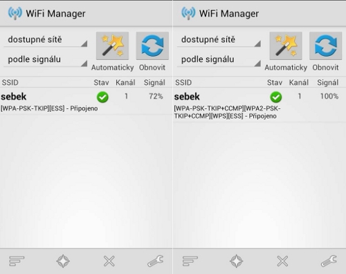 Opakovač D-Link DAP-1320 (1.240 Kč) jsem testoval pouze v dřevostavbě na síti, jejíž Wi-Fi směrovač je umístěn ve vzdálenosti asi deset metrů v další dřevostavbě. Stav sítě před a po instalaci opakovače vidíte na obrázku vlevo, resp. vpravo. Jde o výstup z aplikace Wi-Fi manager pro Android.