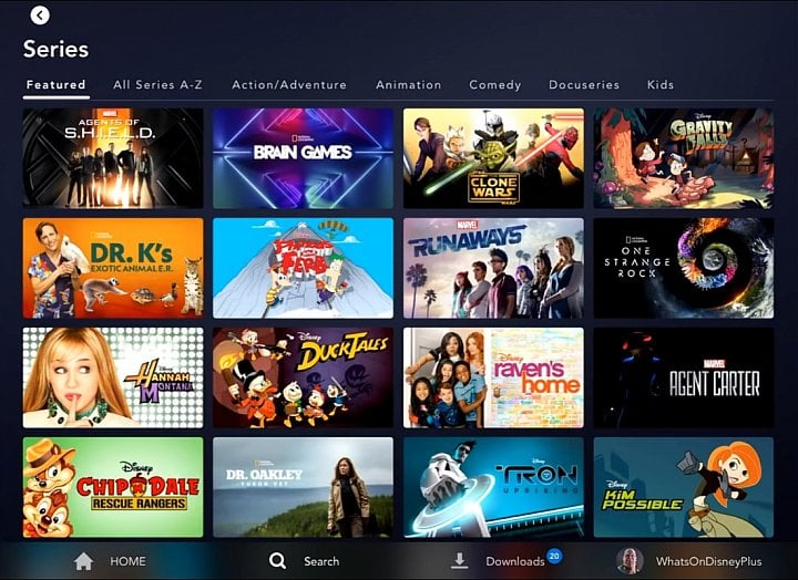 Dále lze z hlavní strany vstoupit do nabídky „Disney Originals“, do katalogu filmů a do katalogu seriálů. Postupně si vše podrobněji představíme.