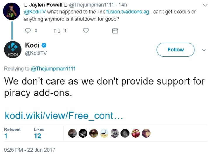 Vzhledem k odstaveným komunikačním kanálům TV Addons nespokojení uživatelé psali kupříkladu na oficiální Twitter Kodi, a to i přes výslovné upozornění v popisu Exodu, že nejde o oficiální součásti software, ale o produkt třetích stran. Tam se zpravidla dočkali suchého odmítnutí s tím, že nelegální software nepodporují…