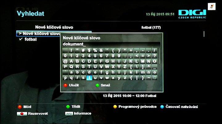 Elektronický programový průvodce (EPG) se zobrazuje u stanic, které jej poskytují. V levém sloupci se zobrazují stanice, v pravém program zvolené stanice na zbytek dne. Z tohoto menu můžeme pomocí virtuální klávesnice i vyhledávat požadované pořady. Zadáte například „fotbal“ a box vypíše všechny stanice, které fotbal podle EPG vysílají. Je zde uvedena stanice, datum a čas vysílání. Protože si přijímač tato zadaná klíčová slova pamatuje, stačí příště zvolit ze seznamu již uložená a vyhledávat. Je zde také časovač nahrávání událostí. Programujeme spuštění nahrávky, nebo jen přepnutí kanálu. Přehled kanálů lze také třídit a vytvářet si oblíbené seznamy. Česká diakritika je zobrazována vesměs bezchybně.