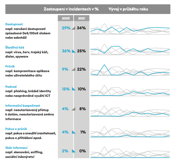 Phishingové útoky představovaly stále nejčastější vektor útoku a jejich sofistikovanost se opět o něco zvýšila (což čas od času vidíte určitě i vy ve své e-mailové schránce). 90 procent dotazovaných organizací uvedlo, že na ně byl v roce 2021 veden phishingový útok (nebo pokus o něj). Například z finančních institucí zaznamenalo pokus o útok 81 procent. Někteří útočníci využívající phishingovou techniku přistoupili k dvoufázovému schématu – první fáze obsahuje odeslání phishingové zprávy s podvrženou adresou a výzvu ke kliknutí na odkaz nebo otevření přílohy. V případě úspěchu následuje druhá fáze, ve které útočníci využívají kompromitovaných e-mailových schránek a z nich rozesílají další phishingové zprávy s cílem infiltrovat další subjekty. Klasifikaci incidentů a meziroční trend uvádí přehledně následující grafika.